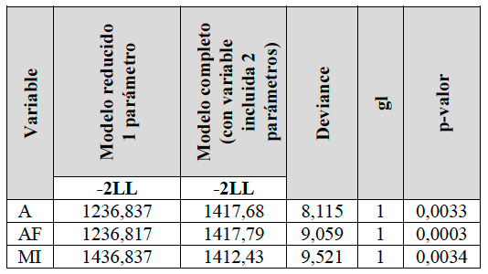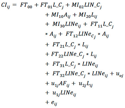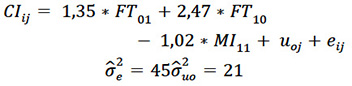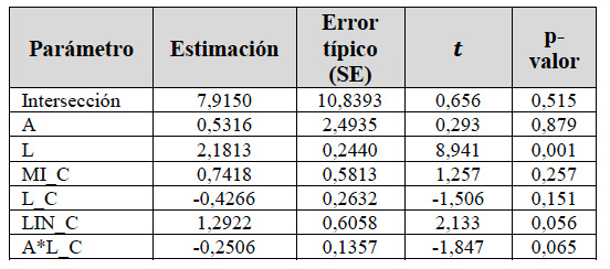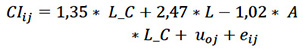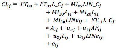 En el modelo CI se procedió a realizar un análisis excluyendo la variable L del componente aleatorio (modelo reducido) e incluyendo dicha variable en el componente aleatorio (modelo completo), cuyos resultados muestran parámetros fijos en modelo reducido L 2.47*** (0.01), MI_C 1.35*** (0.15), A*L_C - 1.02*** (0.07) y aleatorios=21 promedio (16.15), residuos 45*** (4.5) -2 log de la verosimilitud restringida 1.455,046; ***p<0.01; y en modelo completo reducido L 2.1 (7.01), MI_C 1.75*** (0.15), A*L_C -0.02*** (0.105) y aleatorios=824 promedio (544.2), residuos 33*** (3.5) y -2 log de la verosimilitud restringida 1.517,157; ***p<0.01.