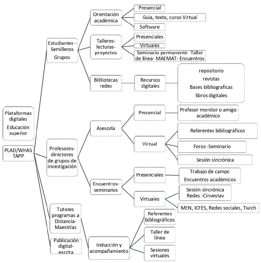 En el presente trabajo, a los fines de estudiar las posibilidades de desarrollar competencias en innovación en los programas de pregrado y postgrado utilizando estrategias basadas en plataformas digitales, se analiza el impacto de la plataforma de apoyo docente PLAD de la Universidad Francisco de Paula Santander en Colombia, así como el apoyo de chat de WhatsApp en ésta y en otras instituciones. Para ello, se diseña una estrategia formativa basada en distintas actividades didácticas tal y como se muestra en la Figura 1, teniéndose como ejes centrales la participación de estudiantes en semilleros de investigación, la participación de docentes como directores de grupos de investigación, la tutoría de programas de maestría a distancia, y el desarrollo de publicaciones por parte de docentes y estudiantes.