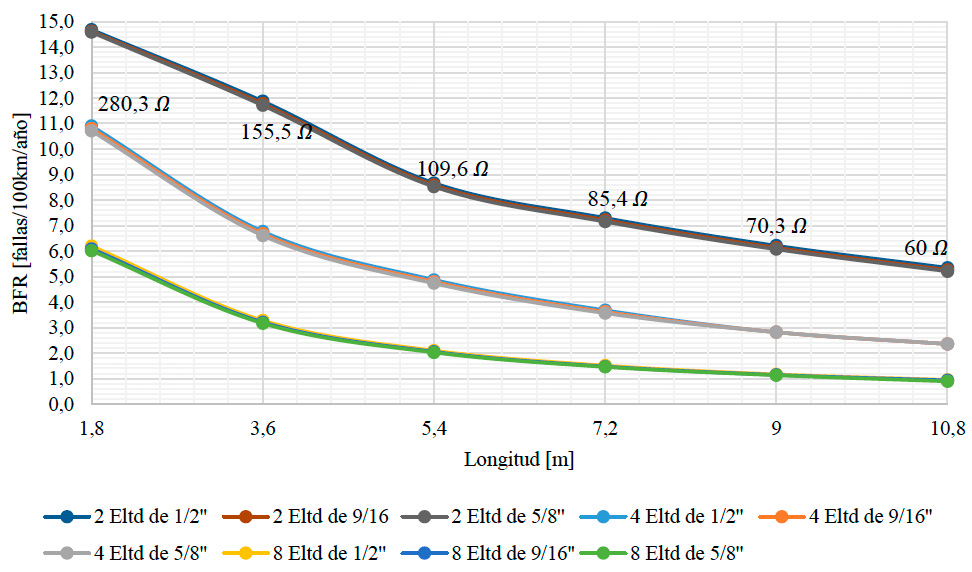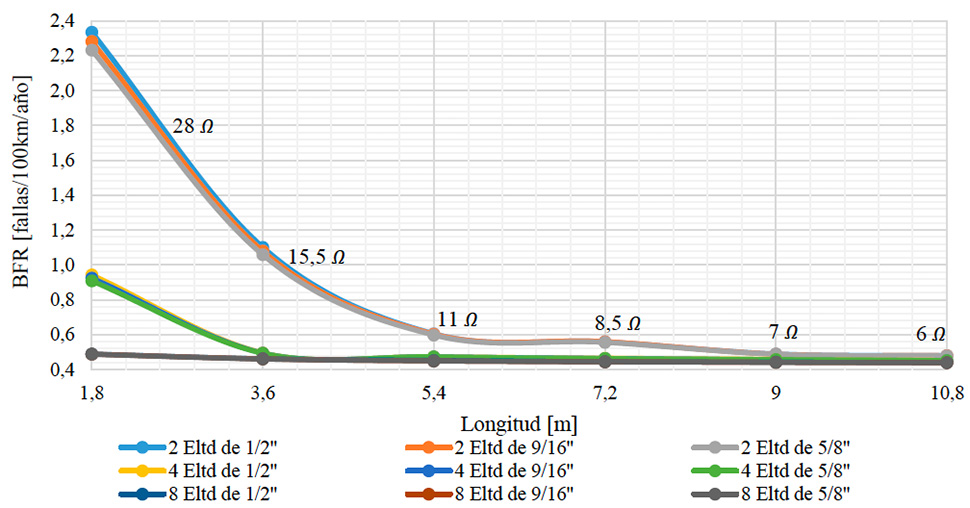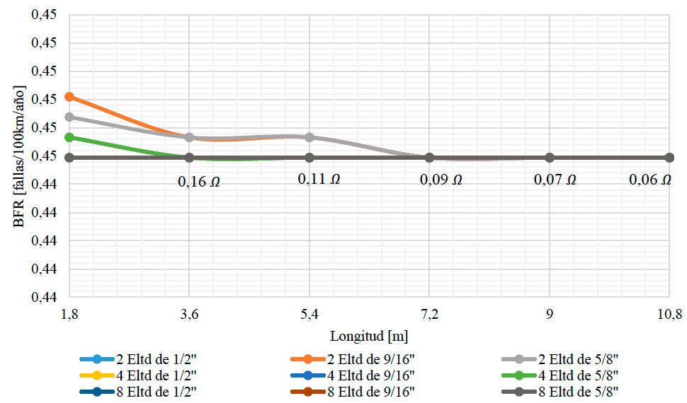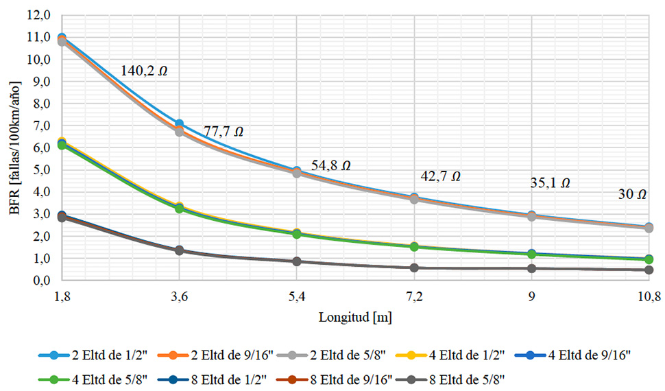 En la Figura 9, para una resistividad de 1 Ω.m, se puede ver que el valor del BFR es el mismo, dado que la resistencia de puesta a tierra varía de forma pequeña a medida que aumenta la longitud, el radio y la cantidad de electrodos. Para una resistividad de 100 Ω.m (Figura 10), se aprecia que el valor más alto del BFR es de 2.3 fallas/100km/año, correspondiente a 2 electrodos y 1.8 m de longitud; al utilizar 4 electrodos el BFR se reduce en un 61% y con 8 electrodos en un 83%. Para una longitud de 9 m o superior, se logra una máxima reducción del 83% utilizando 2, 4 u 8 electrodos, observándose que a partir de este punto no existe variación apreciable del BFR. En la Figura 11, se presenta el resultado para una resistividad de 500 Ω.m. En este caso el máximo valor del BFR es de 10.8 fallas/100km/año. Para una longitud de 5.4 m y utilizando 2 electrodos el BFR se reduce en un 56%, con 4 electrodos en un 81% y con 8 electrodos en un 93%.