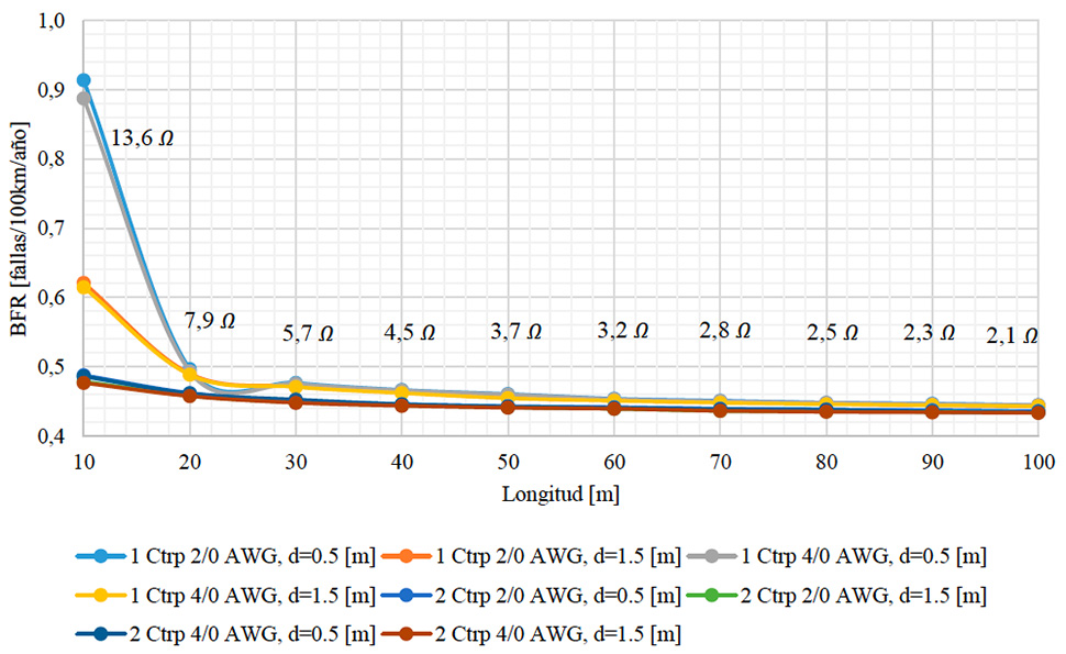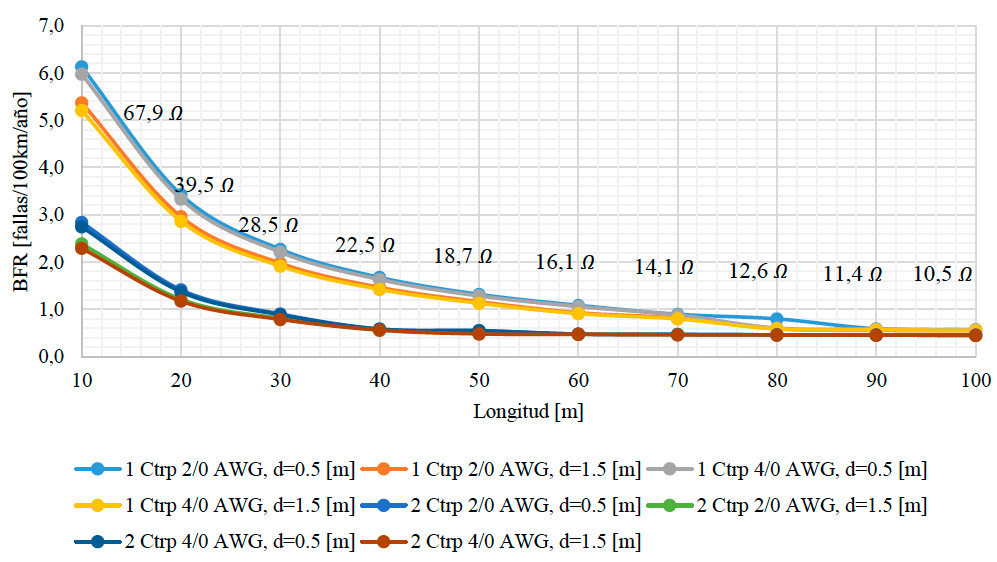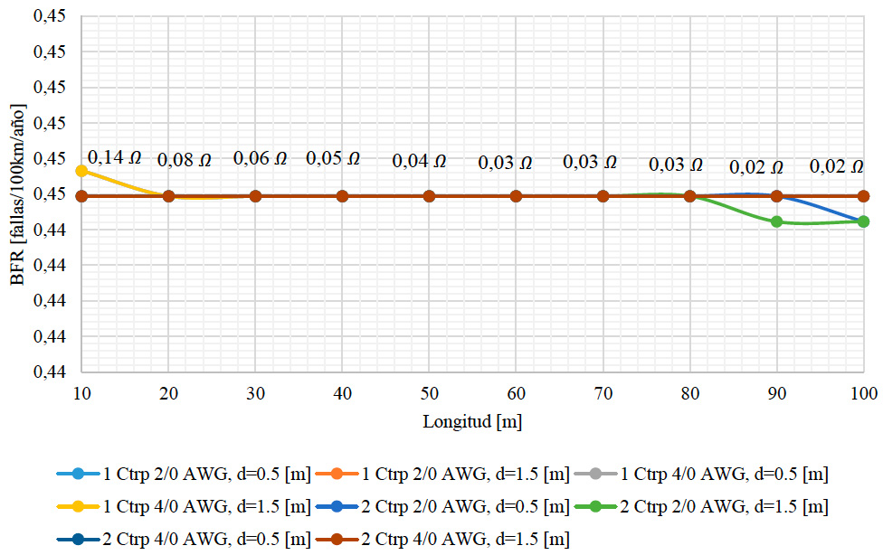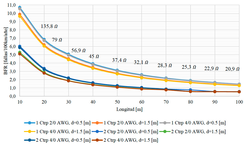 En la Figura 13, se describe el cambio del BFR a medida que se aumenta la longitud del cable del contrapeso con resistividad de 1 𝛺. 𝑚. En este escenario no hay variación significativa del BFR, debido al pequeño cambio en la resistencia en función de la longitud, el calibre o el enterramiento. Para una resistividad de 100 𝛺. 𝑚, mostrada en la Figura 14, En este escenario se aprecia que el valor más alto del BFR es de 0.9 fallas/100km/año, correspondiente a 1 contrapeso de 10 m de longitud y enterramiento de 0.5 m; al utilizar 1 contrapeso con enterramiento de 1.5 m el BFR se reduce en un 32%; al utilizar 2 contrapesos con enterramiento de 0.5 m o 1.5 m el BFR se reduce en un 47%. Para longitudes superiores de 30 m la tasa de fallas tiende a estabilizarse. Para una conductividad de 500 Ω.m (Figura 15) se aprecia que el valor más alto del BFR es de 6.1 fallas/100km/año. Para 30 m de longitud y un contrapeso con enterramiento de 0.5 m el BFR se reduce en un 64%; al utilizar 2 contrapesos con enterramiento de 1.5 m en un 87%. Para una longitud de 80 m o superior el BFR se reduce en un 92% sin importar la configuración. Para 1000 Ω.m (Figura 16), se aprecia que el valor más alto del BFR es de 10.7 fallas/100km/año.