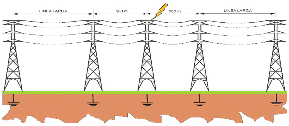 Para la línea se utiliza un cable de fase tipo FLINT AAAC con resistencia de 0.089 Ω/km y 2.52 cm de diámetro, con un cable de guarda tipo Alumoweld 7 No. 9 AWG con resistencia de 1.844 Ω/km y 8.71 mm de diámetro. En ATPDraw se utiliza la herramienta “LCC”, en la que se selecciona el modelo Bergeron [24] para parámetros distribuidos de la línea, teniendo en cuenta entre otros, la resistividad del terreno que varía dependiendo del tipo de suelo (Tabla 1), y la frecuencia a la cual viaja la onda, asumida como 100 kHz; se asume un vano de 500 m para las torres adyacentes que producen las reflexiones más importantes (se asumió esa longitud como un valor promedio válido para diferentes tipos de terrenos: planos y no planos), y de 2.5 km para representar una línea larga, en la cual las reflexiones sobrepasan el tiempo de los 20 µs, a un 90% de la velocidad de la luz [4], [17], las cuales no entran a alterar los datos de la simulación.