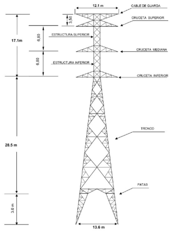 El sistema por analizar está compuesto por tres torres y una línea larga en sus extremos (Figura 1), cada una de suspensión auto soportada de circuito doble triangular vertical, con doble cable de guarda, una altura total de 48,6 m, un ancho de 13,6 m y una tensión de servicio de 230 kV como se muestra en la Figura 2. La torre central será el punto de análisis del comportamiento ante una descarga atmosférica. Las torres adyacentes están separadas 500 m y se diseñan de forma simplificada como una sola impedancia característica que representa la estructura total de la torre. En estas se reflejan las ondas viajeras que recorren el cable de guarda y las estructuras cercanas, las cuales son de vital importancia en la tensión vista en los aisladores [4]. Las dos torres en los extremos se ubican a 2.5 km del sistema a analizar y las reflexiones de las ondas en estas torres llegan en un rango de tiempo que no influye en la tensión vista en los aisladores de la torre impactada.