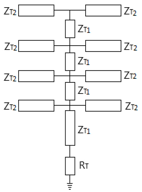 ZT1 representa la impedancia característica de la parte central vertical de la estructura compuesta por las patas, el tronco la estructura inferior y la estructura superior; ZT2 representa la impedancia característica de cada uno de los brazos de la torre (Figura 2); y RT representa la resistencia de puesta a tierra. Para el modelo se obtiene que la impedancia del tronco de la torre es ZT1=139.09 Ω y la impedancia de los brazos o crucetas de la torre es ZT2=97.17 Ω de acuerdo con la ecuación. 1.