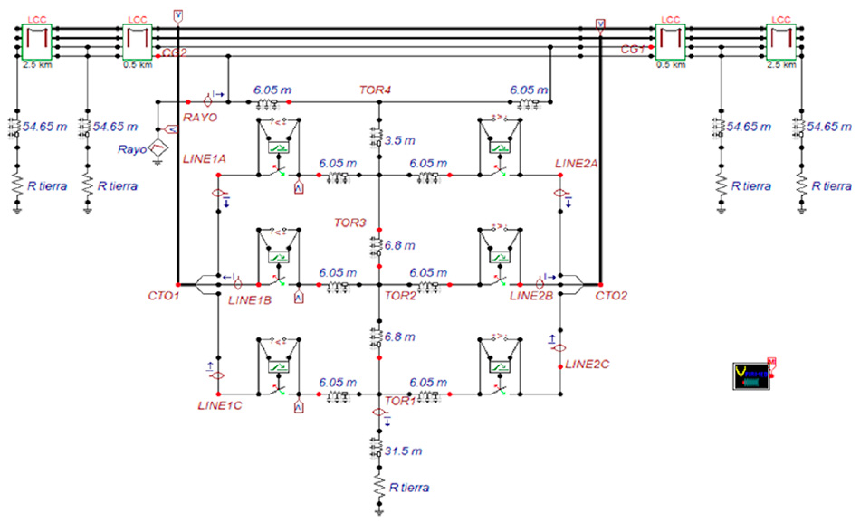 Para modelar en ATPDraw el tramo descrito del sistema de transmisión de 230 kV (Figura 1), se tienen en cuenta la estructura, los aisladores, la línea, los sistemas de puesta tierra y el rayo. El circuito general simulado se presenta en la Figura 4.