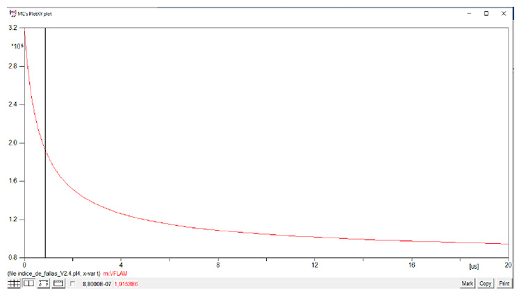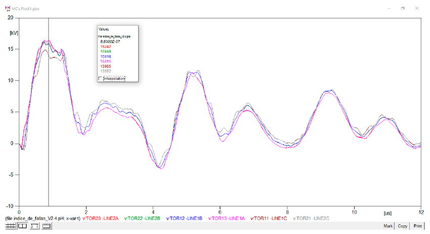 Para el ejemplo de SPT de tierra suplementaria con descrito en la seccion anterior con resistencia de 8.29 Ω. Al modelar la línea en ATPDraw (Figura 3), se procede a modificar los valores de los elementos de resistencia de tierra (R tierra=8.29 Ω) y los valores de resistividad dentro de la herramienta “LCC” en 100 Ω.m, para luego simular y ver las diferentes tensiones entre cada fase y la estructura, en las cuales se busca el punto de tensión más elevado y el tiempo en el que se produce al aplicar una corriente de rayo como la descrita en la sección 2.1.5, la cual es la responsable de que se produzca flameo y corresponde a 16.4 kV en un tiempo de 0.88 μs (Figura 8), luego, con este tiempo se busca el punto de intersección en la curva de tensión soportada por los aisladores (Figura 5) y corresponde a 1.91 MV.