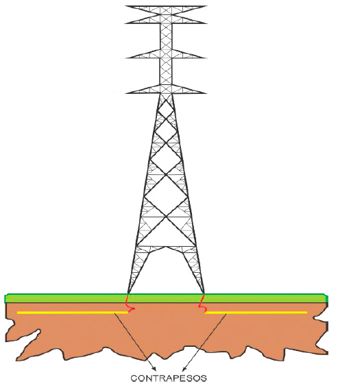 Visacro et al [20] revisa los requerimientos de contrapesos largos en el cálculo del BFR, concluyendo que la longitud efectiva del contrapeso es mayor que la de electrodos horizontales y de cuatro estrellas. Montaña [21] da importantes recomendaciones para los sistemas de puestas a tierra de protección contra rayos, entre las que se pueden destacar que los contrapesos son efectivos para longitudes cercanas a los 70 m para terrenos de alta resistividad y de 40 m para baja resistividad, que el mejor desempeño contra rayos se logra cuando se conectan varillas verticales al inicio del contrapeso y no en el extremo abierto y que el incremento de la longitud del contrapeso solo modifica la cola de la tensión, vista en el punto de inyección, y no el pico.
