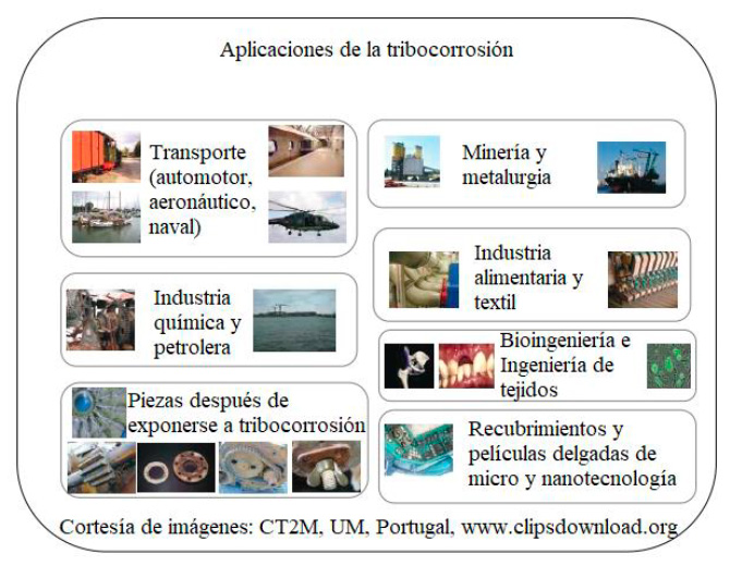 La tribocorrosión está presente en varios sectores de la industria, como se muestra en la Figura 1, estos pueden ser: procesamiento de materiales, transporte, exploración de petróleo y gas, minería, nuclear, implantes médicos y dentales, dispositivos quirúrgicos, aeroespacial, entre otros [9], [10], [11].