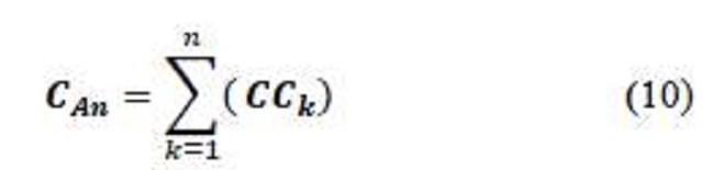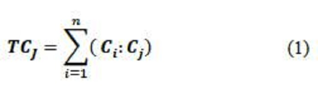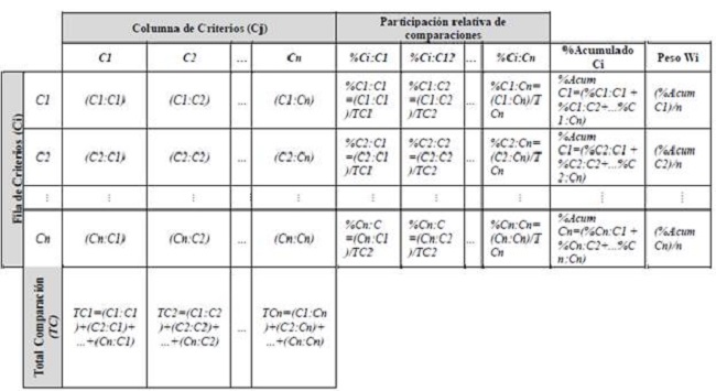 Una vez realizado el registro de cada comparación se procede a calcular el acumulado de cada criterio por columnas de criterios, es decir, el total de puntaje de comparación (TCJ) para cada criterio, obsérvese la Ecuación (1).