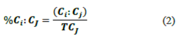 Teniendo el valor total de comparación para cada criterio por columna, se debe buscar la participación relativa de cada comparación, esta consiste en el cociente de cada comparación sobre el total de comparaciones por criterio, la notación en la matriz APC, es la siguiente; (%Ci: Cj), la participación relativa para cada par está dado por la Ecuación (2).