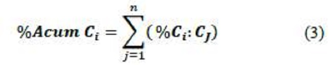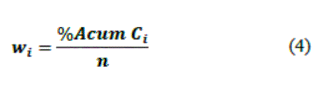 Una vez realizado el registro de la participación relativa de cada comparación Ci se procede a determinar la participación acumulada (%Acum C¡) para cada criterio por fila usando la Ecuación (3).