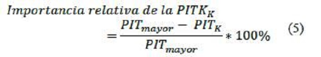 Si el objetivo es minimizar la importancia del subcriterio, como por ejemplo el costo o la población afectada, entonces se debe encontrar el valor de la importancia relativa de la PITk para el subcriterio SCn, la cual está dada por la diferencia entre el valor de la PITk para ese subcriterio (PIT que se está analizando) y el valor de la PIT PITmayor para ese subcriterio (PIT más grande de ese subcriterio). Como se muestra en la Ecuación (5).