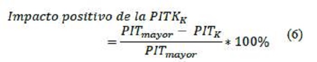 Si el objetivo es maximizar la importancia del subcriterio, como por ejemplo la población beneficiada, entonces, entonces se debe encontrar el valor del impacto positivo de la PITk para el subcriterio SCn, la cual está dada por la diferencia entre el valor de la PITk para ese subcriterio (PIT que se está analizando) y el valor de la PIT PITmayor para ese subcriterio (PIT más grande de ese subcriterio). Como se muestra en la Ecuación (6).