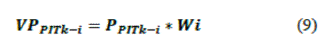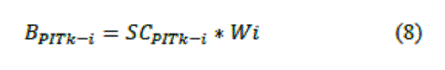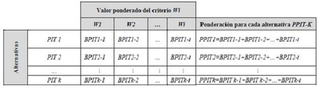 La siguiente etapa del modelo MOPIITEC, es la multiplicación de pesos Wt y puntajes por cada criterio y alternativa o PIT, esta ponderación se denota en la Tabla 12 como BPIT k-n donde este es el producto entre el puntaje de la SCPlT-K obtenido en la APS y el peso Wi , asignado en la APC. La Ecuación (8) muestra la ponderación descrita.