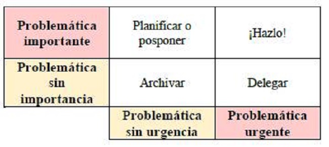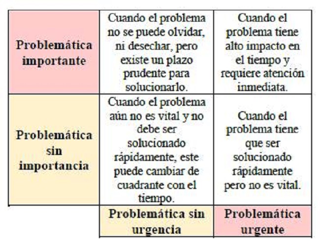 Teniendo en cuenta que el objetivo del MOPGIITEC es priorizar las propuestas, se deberá clasificar la problemática a la cual responde la PIT en uno de los cuadrantes de la matriz de Eisenhower, esta matriz busca mejorar la productividad por medio de la organización y priorización de problemáticas. La matriz de Eisenhower se basa en la clasificación de problemas en importantes o no y urgentes o no [14].