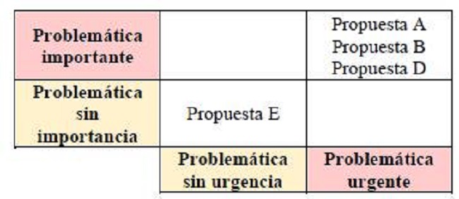 A continuación, se ubican las cuatro propuestas que cumplen la parte legal en la matriz de Eisenhower [14] según su importancia y urgencia. En la Figura 6, se observa que sólo tres propuestas deben ser estudiadas y se descarta la E por no ser ni importante ni urgente.