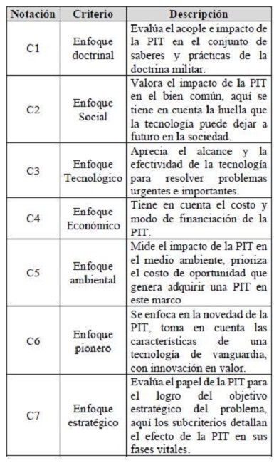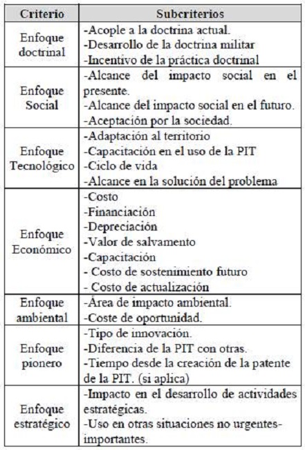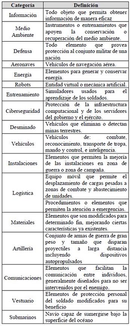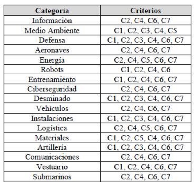 En primer lugar, es necesario comprender, que todas las innovaciones tecnológicas, encajan un marco categórico, es decir, cada recurso pertenece a una rama estratégica, por tanto, se establecen 17 categorías, cada una con criterios propuestos, de manera que la evaluación pueda ser asertiva y no permita sesgo dentro de la evaluación de las PIT's. Estos criterios se describen a detalle en la asignación de pesos para criterios. Estas categorías de aplicación de las innovaciones tecnológicas militares fueron adaptadas de las propuestas por [9] y se relacionan en la Tabla 1.