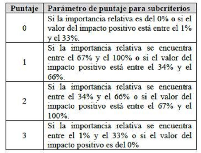 La ponderación de asignación de puntos para subcriterios es una metodología creada para poder definir la relación de los subcriterios de cada criterio con la alternativa, esta relación está dada por la asignación de puntaje, donde el 3 es el más alto y 0 es un puntaje nulo, la sumatoria de esta asignación de puntos de los subcriterios de un criterio especifico será el factor para el producto del criterio especifico con el peso que tenga esté, peso definido por la comparación por pares por el AHP, la sumatoria de estos productos permite la ponderación de criterios. Al final, se realiza una comparación por pares para las categorías hábiles, para luego tener una ponderación definitiva, donde interviene el peso de cada categoría y la ponderación de criterios.