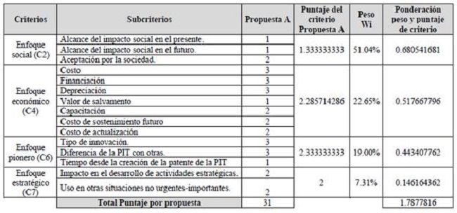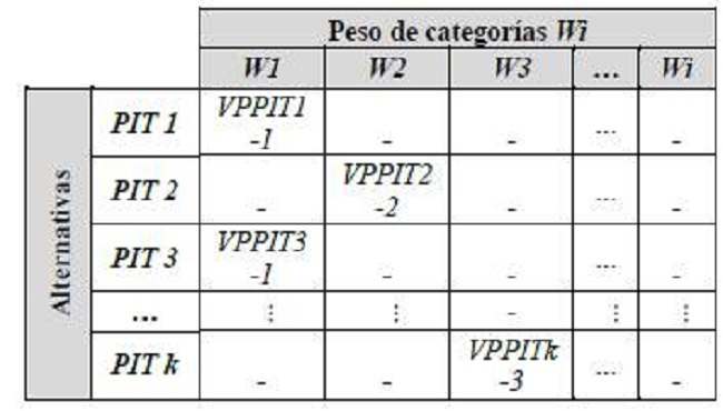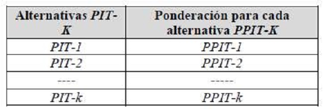 Donde PITK corresponde a cada una de las alternativas de innovación tecnológica que pertenezcan a la misma categoría. Las columnas wi se refieren a cada criterio, una de las ponderaciones descritas en la Ecuación (8), donde i es la cantidad de criterios.