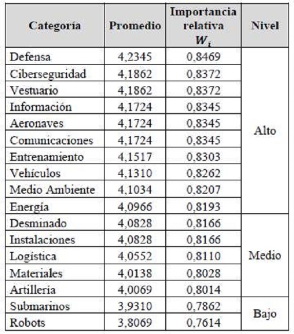 En la Tabla 14 se observa la importancia relativa de las categorías de innovación definidas, se observa la calificación promedio corresponde a 0.8187, con una desviación estándar de 0.2245 y una máxima variación relativa en la ponderación del 8.552%, sin embargo se clasifican en tres niveles de acuerdo a sus rangos, las más importantes corresponden a: Defensa, Ciberseguridad, Vestuario, Información, Aeronaves, Comunicaciones, Entrenamiento, Vehículos Medio Ambiente y Energía; en un nivel de importancia media se ubican las categorías: Desminado, Instalaciones, Logística, Materiales y Artillería. Y finalmente, las categorías menos importantes son: Submarinos y Robots.