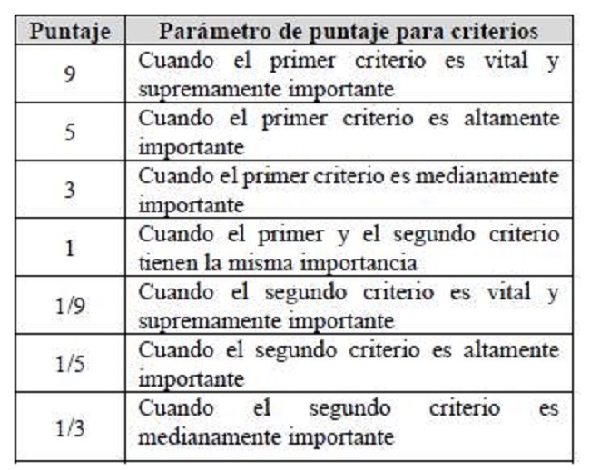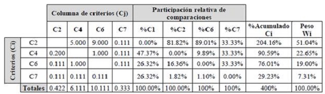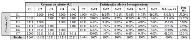 La matriz de asignación de pesos por criterio (APC) es el formato de operación y registro de puntajes, donde se determina la participación relativa de cada comparación y el peso de cada criterio, como se presenta en la Tabla 7.