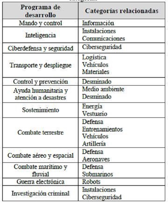 Es importante para el ejército colombiano conocer vías de desarrollo tecnológico que fomenten la evolución militar. En el informe presentado por el Ministerio de Defensa de Colombia, se identifican los pilares de la fuerza pública de Colombia para el 2030 [21], que contempla los enfoques tecnológicos, los cuales se basan en doce programas que cumplen con el desarrollo de capacidades que mejoran las áreas misionales de la fuerza pública colombiana, estos enfoques fueron utilizados como base para la construcción de preguntas para las entrevistas. Estas entrevistas a los integrantes del cuerpo militar se utilizaron para hallar el impacto y límite legal de las innovaciones tecnológicas, las cuales se organizan en categorías, bajo ellas se fundamenta el modelo propuesto. La Tabla 2, presenta la alineación existente entre las categorías y "Los doce programas de desarrollo" formulados por el Ministerio de Defensa Nacional de Colombia.