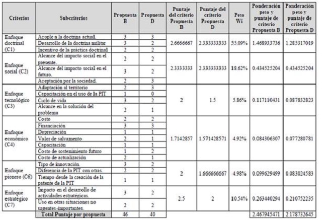 Este paso consiste en obtener el producto de los puntajes de cada PIT multiplicado por el grado de importancia relativa de cada categoría que se relaciona en la Tabla 14, estos valores promedio fueron calculados a partir de la opinión de una muestra de miembros activos de las fuerzas militares encuestados al respecto durante el segundo semestre de 2019.