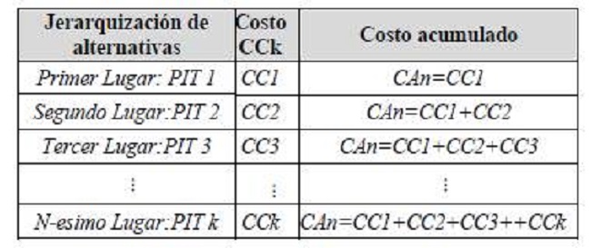 Al Ministerio de defensa se le recomienda seleccionar los proyectos de innovación de todas las fuerzas a través de la adaptación de este modelo y en función del presupuesto aprobado por dicho ministerio, para ello dado que el presupuesto a inversiones o PIT's es limitado, el MOPGIITEC propone seleccionar en el orden de priorización las propuestas, hasta que el costo acumulado, que será sencillamente el costo incrementado con cada PIT que se vaya seleccionando, se vaya acercando al presupuesto de inversión sin pasarse, en la Ecuación (10) se explica el costo acumulado, donde CCk es el costo de la alternativa k, CAn es el costo acumulado para el lugar n-esimo. Luego las propuestas que estén en la parte inferior de la matriz de priorización de alternativas no serán tomadas en cuenta para su adquisición. Obsérvese en la Tabla 23, como se ubica el costo de cada alternativa en la Tabla de priorización.
