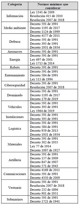 En la Tabla 3 se encuentran las normas legales mínimas a considerar por categoría.