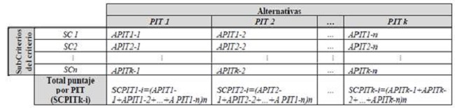 Donde PITK es cada una de las alternativas de innovación tecnológica que pertenezcan a la misma categoría, cuando existen PIT's de diferentes categorías el proceso de APC, APS y PPPC se debe hacer por separado, para cada una de las categorías. Las filas para SCn se refieren a cada uno de los subcriterios que pueda tener cada criterio, esto quiere decir que esta matriz se debe realizar tantas veces como el número de criterios de la categoría. La notación APIT k-n se refiere al puntaje otorgado a esa PITK en el SCn , donde n es la cantidad de subcriterio para el criterio i.