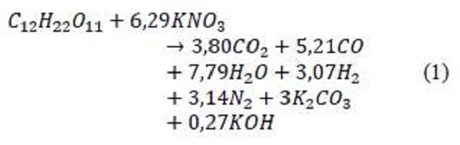 En efecto, la combustión del propelente tipo KNSU está dada por la ecuación 1 (reactivos → productos) (1 mol de sucrosa y 6,29 moles de KNO3) [25].