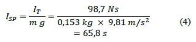 Por su parte, el impulso especifico (Isp) es una medida del rendimiento (potencial) de los combustibles sólidos y está definido como el impulso total impartido por unidad de gasto (peso o volumétrico) de propelente utilizado. En este sentido, un mayor valor de impulso especifico (ISP) indica un propelente eficiente y de alto poder. El cálculo del impulso especifico (ISP) está representado con la ecuación 4, siendo m la masa del grano propelente y g la constante gravitacional. Con base en lo anteriormente descrito, el impulso especifico (ISP) del motor cohete fue de 65,8 s.