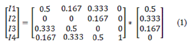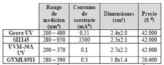 ■ Radiación ultravioleta: se realizó una búsqueda de los diferentes sensores que permiten medir la radiación UV con sus características como se observa en la Tabla 2. La Tabla 3 es un ejemplo de la matriz de atributos que se aplica de manera similiar para cada una de las demás variables de acuerdo con las condiciones planteadas en la Tabla 1. La matriz detalla los valores ponderados según la importancia de cada condición. A través de la Tabla 1 se evaluaron los diferentes sensores empleando las matrices de coeficientes de énfasis; con ello se construye la matriz de decisión de la Ecuación 1, la cual agrupa los pesos de la Tabla 3 y las matrices de coeficientes de énfasis; donde I1-GROVE UV, I2-SI1145, I3-UVM-30A UV, I4-GYML8511.