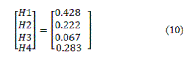 Los resultados de la Ecuación 7 se observan en la Ecuación 8, donde H3 contiene el mayor puntaje, por lo que el sensor SKU: SEN0193 es la mejor opción para la medición de la humedad del suelo con un resultado de 0.427.