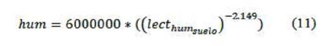 En la etapa de medición de humedad del suelo se realiza un proceso de conversión para calcular el porcentaje de humedad mediante la Ecuación 11, la cual se obtiene a través de un proceso de calibración similar a [24], hay que mencionar que se requiere de una activación previa del servomotor, posterior a la realización de esto se repite el procedimiento de los demás sensores y se desactiva el servomotor para regresar el sensor a su posición inicial.