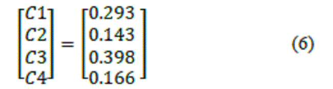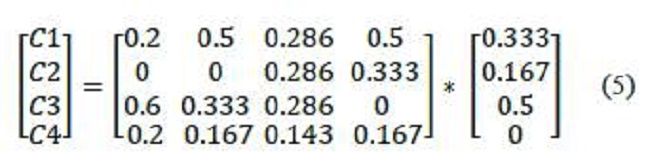 ■ Dióxido de carbono: en la Tabla 5 se encuentran diferentes sensores que permiten medir CO2 y sus características. Teniendo en cuenta la Tabla 1 se compararon los cuatro atributos entre los diferentes sensores empleando las matrices de coeficientes de énfasis; lo cual permite construir la matriz de decisión de la Ecuación 5 que agrupa los pesos de la matriz de atributos y las matrices de coeficientes de énfasis; donde C1-MQ135, C2-MG811, C3- MH-Z19B, C4-MH-Z14A.