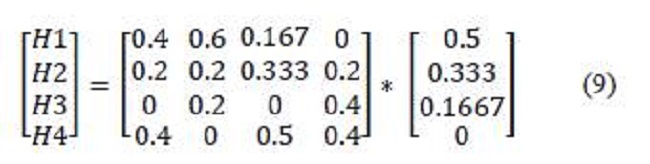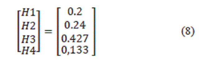 ■ Humedad del suelo: la Tabla 6 detalla diferentes sensores que permiten medir la humedad del suelo con sus respectivas características. Se realizó la comparación de los cuatro atributos entre los diferentes sensores empleando las matrices de coeficientes de énfasis teniendo en cuenta la Tabla 1; con ello se construye la matriz de decisión de la Ecuación 5, la cual agrupa los pesos de la matriz de atributos y las matrices de coeficientes de énfasis; donde Hl-Sonda YL19, H2-Resistente a corrosión, H3-SKU: SEN0193, H4-SKU: SEN0114.