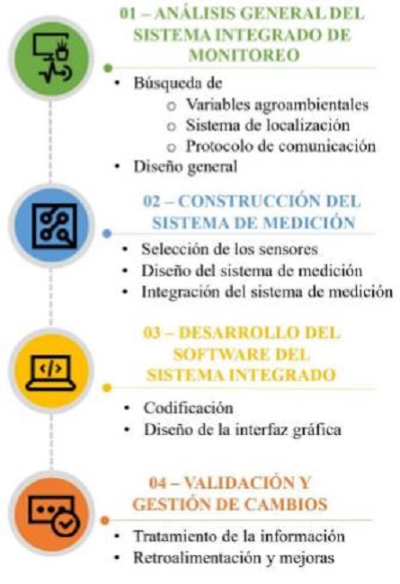 El diseño y construcción del sistema integrado de monitoreo se desarrolla en cuatro etapas ilustradas en la Figura 1, las cuales se definen de acuerdo con las necesidades del proyecto y permiten la medición de las variables agroambientales.