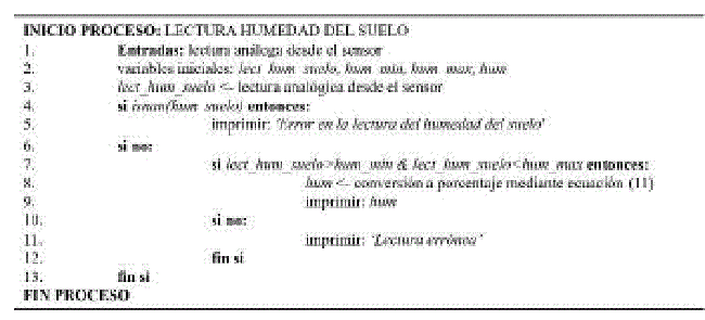 Humedad del suelo: la Figura 10 representa la lógica de programación del sensor de humedad del suelo. Para realizar la toma de mediciones el sensor se conecta a un pin de lectura analógica del Arduino, este se encarga de realizar la lectura y convertir los datos recibidos a valores de humedad aplicando la Ecuación 11 obtenida en la calibración inicial. Cabe resaltar que mientras el servomotor no se active, el sistema envía el valor de -1 % para identificarla como un valor descartable en el análisis.
