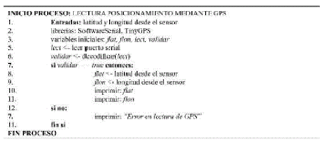 GPS: la lógica de programación para el módulo GPS se representa en la Figura 11, este implementa el protocolo de comunicación UART, por lo que se emplea la librería SoftwareSerial proporcionada por Arduino, además la librería TinyGPS encargada de procesar los datos proporcionados por el módulo GPS; para su funcionamiento se decodifican los bytes entregados, entre los cuales se encuentra información de latitud, longitud, variación magnética, fecha, entre otros; posterior a verificar la información se extraen los datos de latitud y longitud para visualizarlos, en caso de recibir datos nulos o incorrectos se informa al usuario del error.