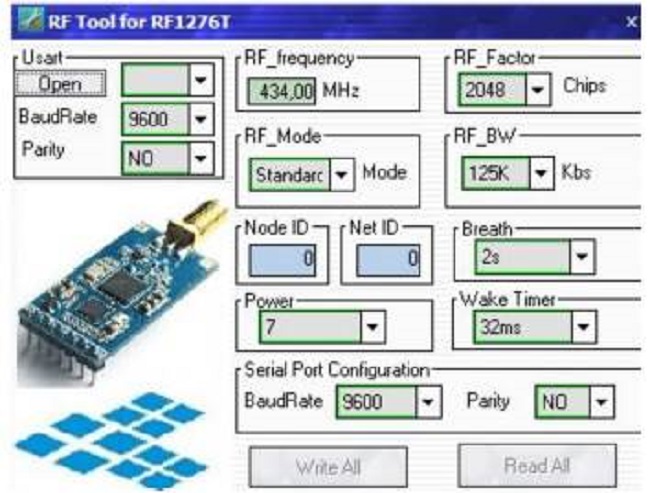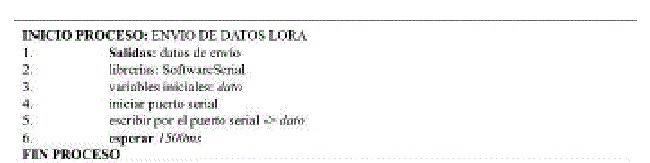 LoRa: Los módulos de comunicación LoRa requieren de un establecimiento de parámetros previo a su implementación, para ello se utiliza el software libre "RF tool for RF1276T" de la Figura 12 proporcionado por "AppconWireless", esta herramienta permite ajustar los valores de frecuencia, velocidad de baudios, ID del nodo e ID de la red, los cuales deben estar sincronizados para una correcta comunicación punto a punto. El pseudocódigo de la Figura 13 representa el funcionamiento del módulo transmisor de comunicación LoRa en el Arduino Nano, donde los datos son escritos a través del puerto serial al módulo, el cual automáticamente los transmite a los demás nodos presentes en el sistema, en este caso en concreto, al módulo LoRa conectado en el puerto USB del computador donde se encuentre la interfaz gráfica instalada.