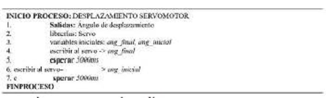Servomotor: La lógica de programación para el servomotor se representa en la Figura 14, este implementa la librería Servo proporcionada por Arduino; para su funcionamiento se le envía el ángulo de desplazamiento deseado a la librería, la cual se encarga de convertir este valor a datos PWM y enviarlos al servomotor para que realice el respectivo movimiento, posteriormente se repite el proceso para ubicar el servomotor en su posición inicial.