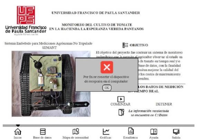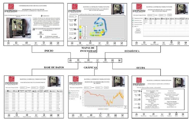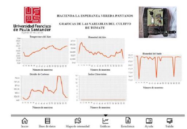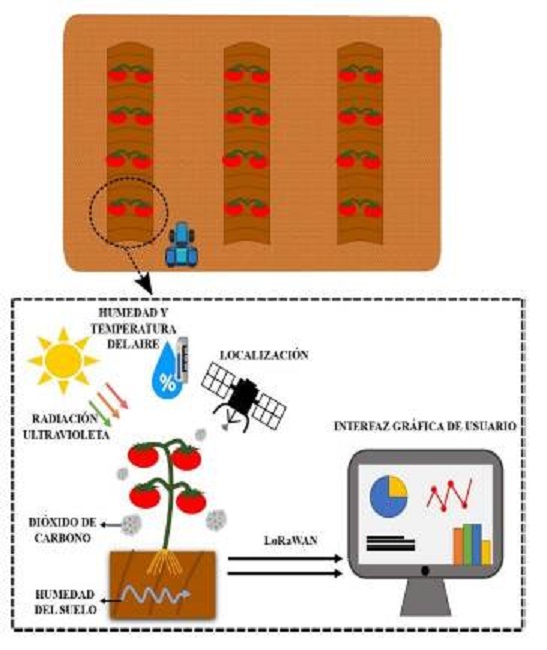 Por tal motivo, este artículo desarrolla un sistema integrado de monitoreo inalámbrico de variables agroambientales como dióxido de carbono (CO2), temperatura, radiación ultravioleta (UV) y humedad del aire y suelo para la generación de mapas de intensidad implementando el sistema de posicionamiento global (GPS); además, emplea el protocolo de comunicación LoRaWAN para él envió de los datos por su largo alcance (comprendido entre 10 - 20 Km), alta tolerancia a interferencias y bajo consumo energético. La información es recibida, almacenada y mostrada en una interfaz gráfica de usuario desarrollada en el lenguaje de programación Java utilizando la versión Java 8, con el objetivo de visualizar los mapas de cada una de las variables en la producción de un cultivo de tomate y observar su comportamiento en el tiempo. 2.