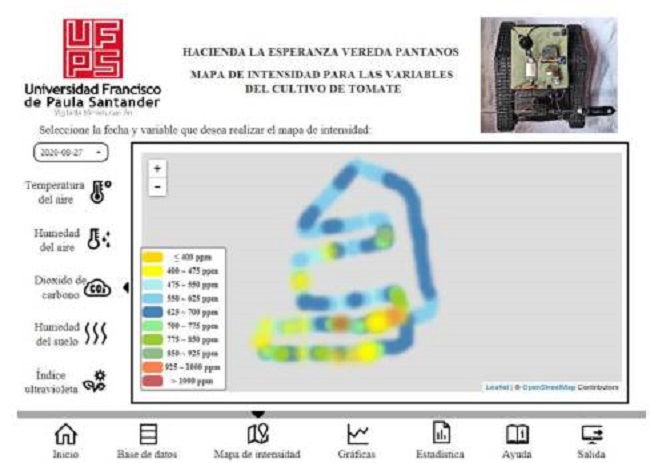 Una de las herramientas de mayor utilidad son los mapas de intensidad, definidos como una visualización de datos para representar valores en una imagen bidimensional utilizando colores [5], estos valores indican diferentes rangos de las variables agroambientales y son utilizados en la analítica de datos agrícolas, lo anterior les permite a los productores agrícolas observar la calidad de las condiciones agroambientales del terreno para tomar mejores decisiones en el cuidado del cultivo [6].