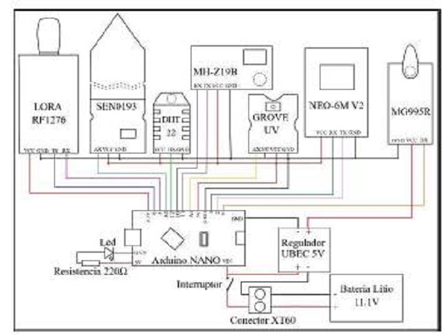 La Figura 3 detalla las conexiones empleadas para el sistema de medición, utilizando una placa Arduino nano, debido a que tiene pines análogos y digitales adaptables al protocolo de comunicación UART, permitiendo interconectar la instrumentación conformada por el GPS y los sensores SEN0193, DHT22, GROVE UV y MH-Z19B, además del módulo de comunicación LoRa RF1276 y el servomotor.