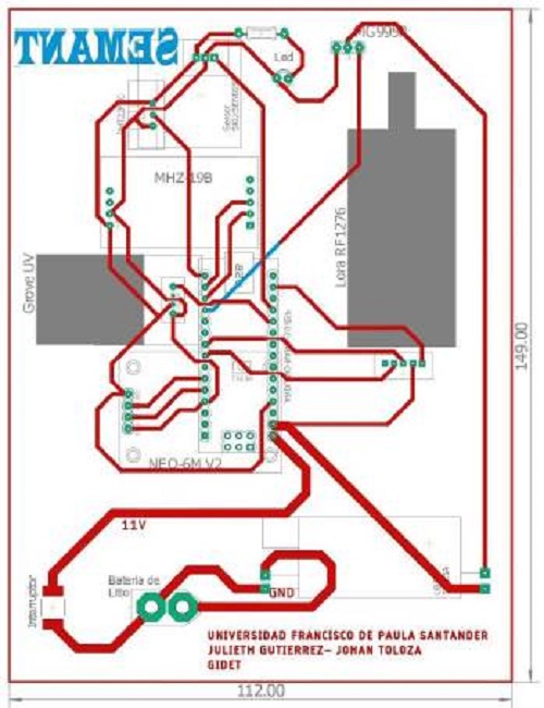 La Figura 4 integra todos los componentes en la PCB donde los sensores se encuentran distribuidos equitativamente en la placa, con el objetivo de realizar trayectorias cortas y evitar interconexión entre estas, debido a que en caso de encontrarse muy contiguos se pueden generar fallas como mediciones erróneas o daño en los dispositivos; se debe agregar que el regulador UBEC y los sensores GROVE UV y LoRa RF1276 no contaban con librerías en el software de diseño, por lo tanto fue necesario construirlos considerando las dimensiones de estos.
