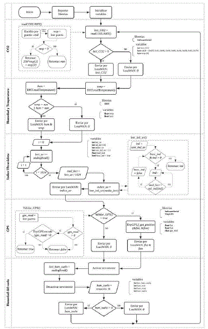El algoritmo del sistema de medición de la Figura 6 contiene el proceso de medición de las variables de CO2, humedad del suelo, índice ultravioleta y, humedad y temperatura del ambiente, además de los datos de geolocalización.