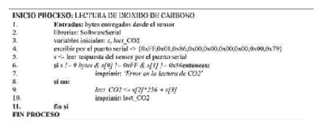 • Dióxido de carbono: la lógica de programación para el sensor de dióxido de carbono se representa en la Figura 7, teniendo en cuenta que para su correcto funcionamiento se requiere un precalentamiento de 3 minutos antes de tomar las mediciones. Para ello, se emplean los niveles TTL de comunicación serial que dispone el sensor, por medio del cual se envía una trama de 9 bytes específicos con la finalidad de activar el sensor e iniciar la medición de CO2; éste envía una respuesta de 9 bytes al Arduino, el cual realiza un proceso de decodificación y verifica los datos recibidos para convertirlos en lecturas de CO2.