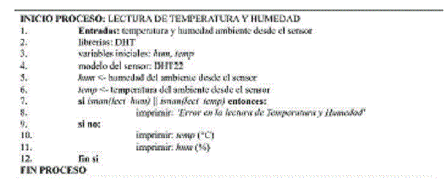 Temperatura y humedad: el pseudocódigo de la Figura 8 describe el funcionamiento del sensor de humedad y temperatura DHT22, el cual se mantiene inicialmente en modo de bajo consumo al momento de encender; únicamente pasa a modo ejecución cuando el Arduino envía la señal de activación por el pin de datos, en este modo el sensor realiza la toma de mediciones y envía una respuesta de 40 bits a la placa, los cuales son decodificados mediante la librería "DHT" y convertidos a valores de lectura de las variables de temperatura y humedad.