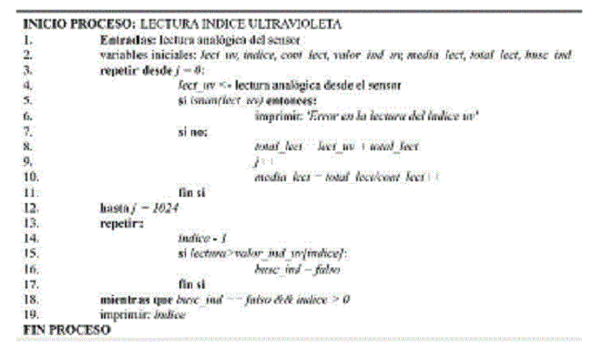 El pseudocódigo de la Figura 9 describe el funcionamiento del sensor de radiación ultravioleta, este se conecta a un pin analógico del Arduino encargado de tomar la medición, considerando que se promedian 1024 lecturas para obtener un resultado más preciso, debido a que la resolución del conversor análogo-digital que cuenta el Arduino es de 10 bits; finalmente, el valor obtenido es comparado con datos de medición de la Tabla 8 para conocer el valor de índice UV presente al momento de realizar la medición.