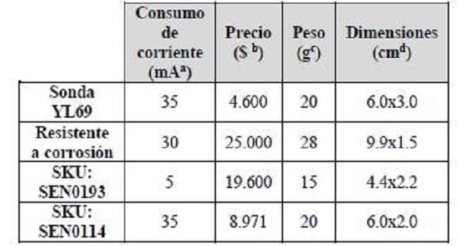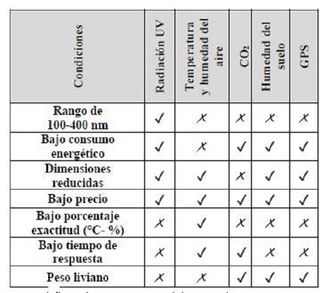 La Tabla 1 representa las condiciones técnicas a tener en cuenta en la selección de los sensores para cada una de las variables agroambientales a medir y el GPS.